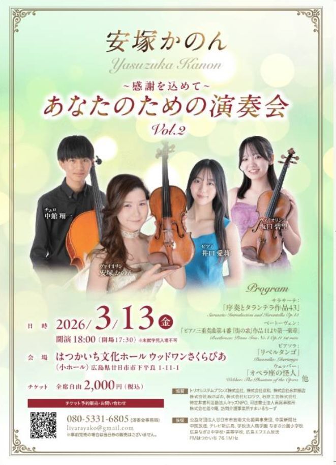 Furthermore, on March 13th, a concert titled “With Gratitude: A Concert for You” is scheduled to be held at the Hatsukaichi Cultural Hall (Woodone Sakurapia) in Hiroshima.