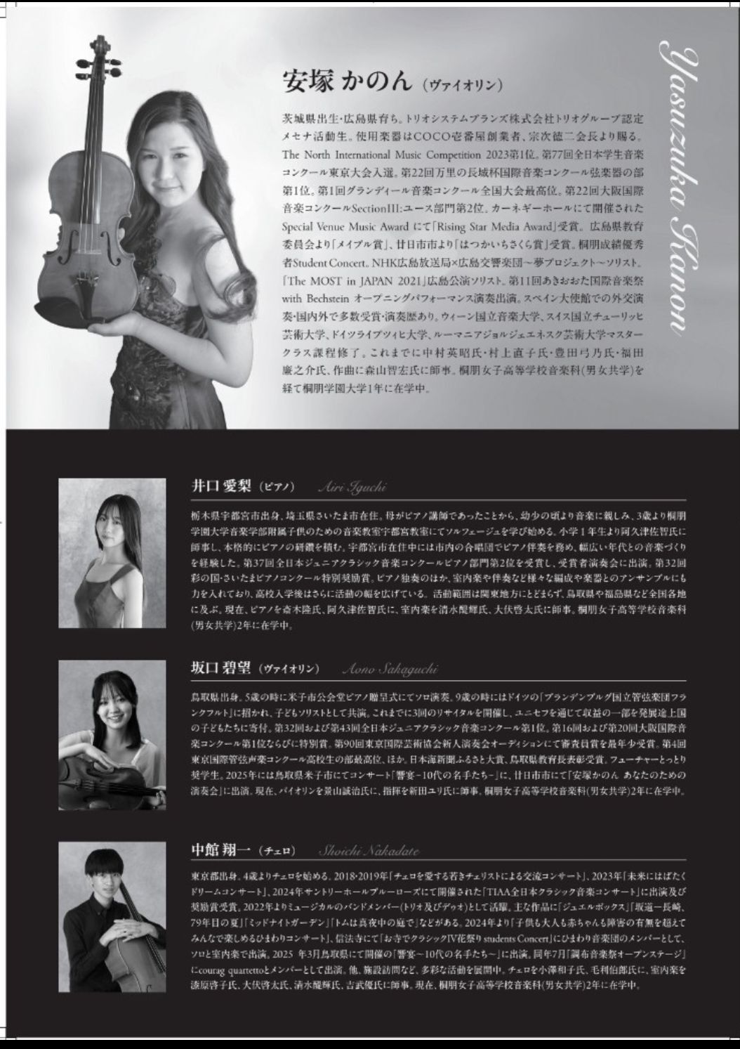 Trio Group Certified Mécénat Activities student, currently enrolled in her first year at Toho Gakuen College of Music, having graduated from Toho Girls’ High School. She was awarded First Place at The North International Music Competition 2023, and was a finalist in the 77th All Japan Student Music Competition Tokyo Round. She also secured First Place in the Middle School Division of the String Instrument category at the 22nd Great Wall Cup International Music Competition. Further accolades include Second Place at the 1st Grandir Music Competition National Final, and Second Place in Section III: Youth Division at the 22nd Osaka International Music Competition. She received the “Rising Star Media Award” at the Special Venue Music Award held at Carnegie Hall. She has completed masterclasses at the University of Music and Theatre “Felix Mendelssohn Bartholdy” Leipzig (Germany), Zurich University of the Arts (Switzerland), George Enescu National University of Arts (Romania), and the University of Music and Performing Arts Vienna (Austria). She has been honored with the “Maple Award” from the Hiroshima Prefectural Board of Education and the “Hatsukaichi Sakura Award” from Hatsukaichi City, Hiroshima Prefecture. She has performed as a soloist in the NHK Hiroshima Broadcasting Station x Hiroshima Symphony Orchestra ~Dream Project~, and also as a soloist in “The MOST in JAPAN 2021” Hiroshima performance. She played in the opening performance of the 11th Akioota International Music Festival with Bechstein. She has received numerous awards and performed extensively both in Japan and internationally. She has studied violin under Yumino Toyota, Naoko Murakami, Hideaki Nakamura, and Rennosuke Fukuda, and composition under Tomohiro Moriyama.